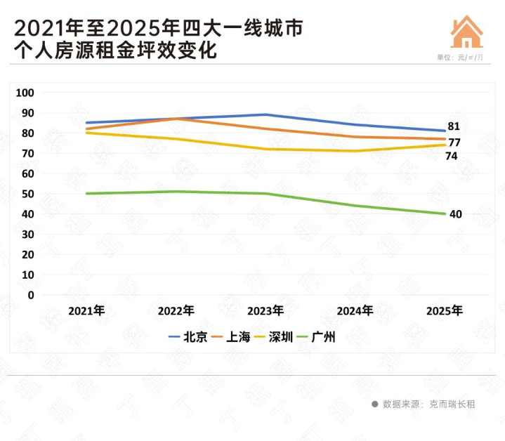從房錢進展來看,一線城市房錢高位分化,其中北京2025年個東說念主房源房錢坪效為81元/㎡/月,同比下落3.6%。廣州房錢坪效為40元/㎡/月,同比下落9.1%。
