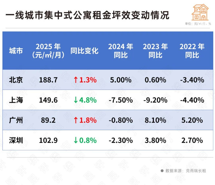 從聚首式公寓來看,北京、廣州兩城2025年房錢同比高潮,上海、深圳延續轉換。
